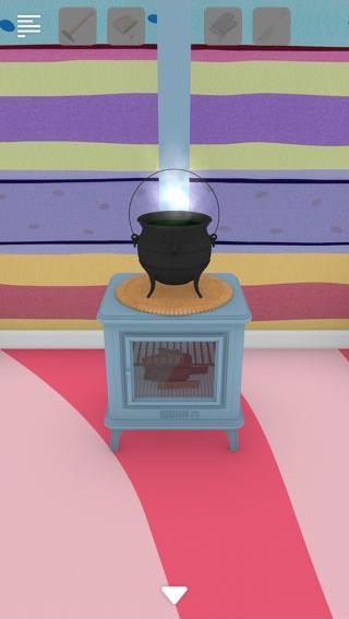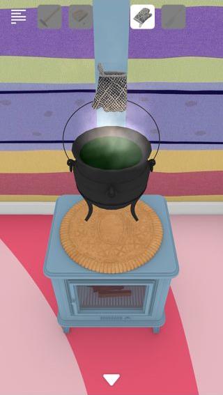 ストーブの上の鍋を「手袋」で持ち上げる。