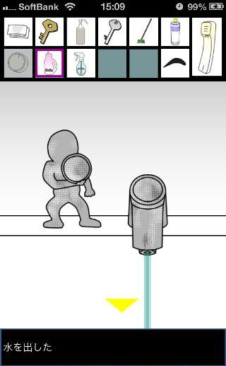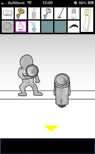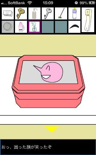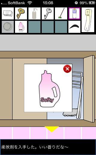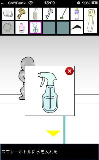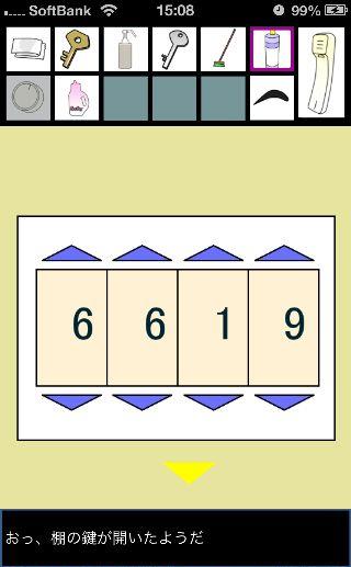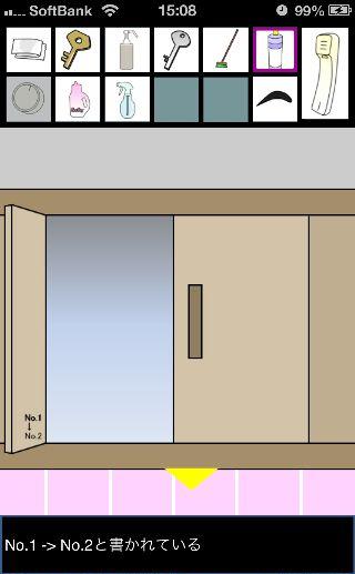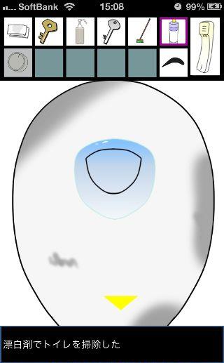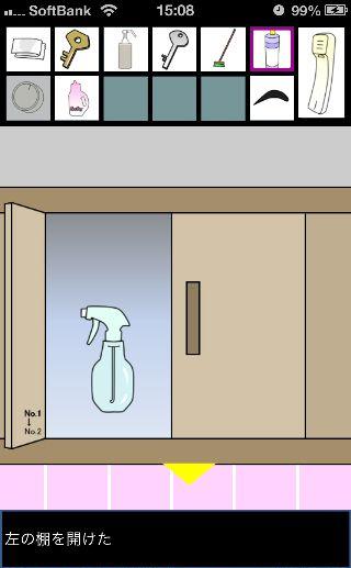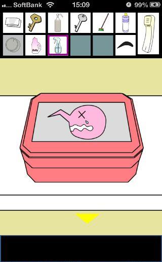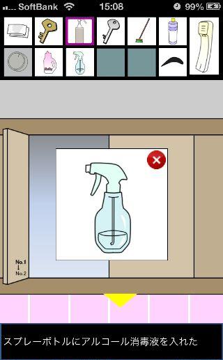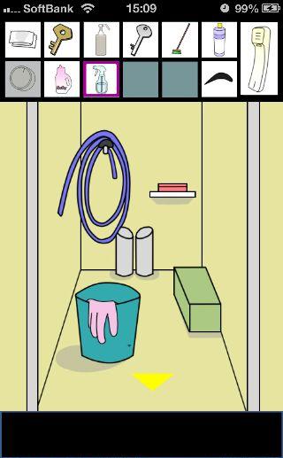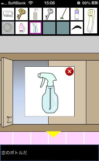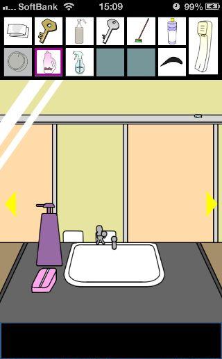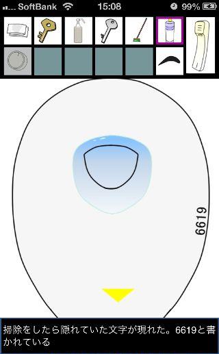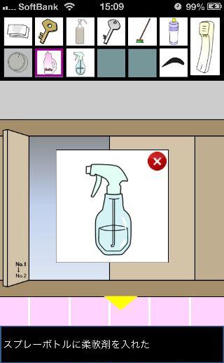 脱出ゲーム トイレからの脱出 無料 0 評価する 送信する 攻略その3 「漂白洗剤」を使って掃除をして、『6619』を確認。 外に出て右に移動。 右の棚を調べる。 「柔軟剤」を入手して、左の扉の装置へ。 『6619』に合わせて、扉を開ける。 「スプレーボトル」を入手して、左下に書かれている『No.1→No.2』を確認。 「スプレーボトル」に「アルコール消毒液」を入れる。 さらに「柔軟剤」を入れて、洗面台の前へ。 蛇口をひねって、水を出す。 「スプレーボトル」に水を入れて、用具入れへ移動。 奥の赤い箱に「スプレーボトル」の液を吹き付ける。 攻略その1 攻略その2 攻略その3 攻略その4