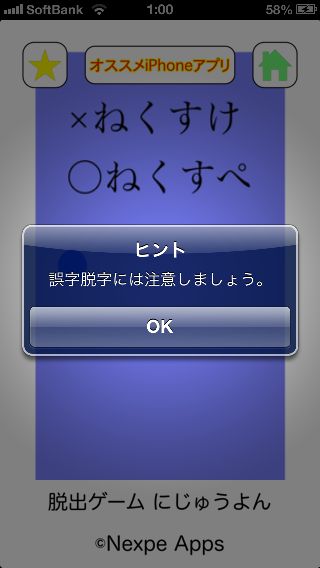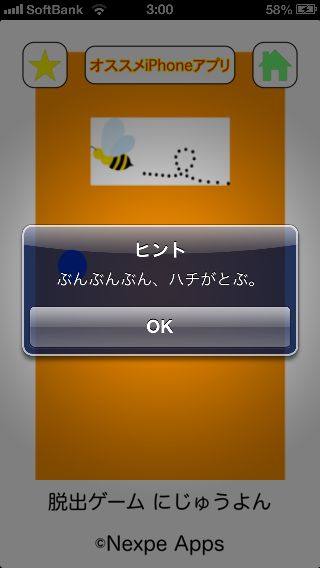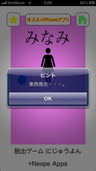 脱出ゲーム にじゅうよん (リアル謎解きゲーム) 無料 0 評価する 送信する STAGE 7~12 STAGE 7 「誤字→5時」 『5:00、17:00』 STAGE 8 時計の短針が南を指す時刻。 『6:00、18:00』 STAGE 9 おやつの時間。 『3:00、15:00』 STAGE 10 「蜂→八」 『8:00、20:00』 STAGE 11 「くじ引き→9時引き」 『9:00、21:00』 STAGE 12 「おばけ→霊→0」 『0:00、24:00』 STAGE 1~6 STAGE 7~12