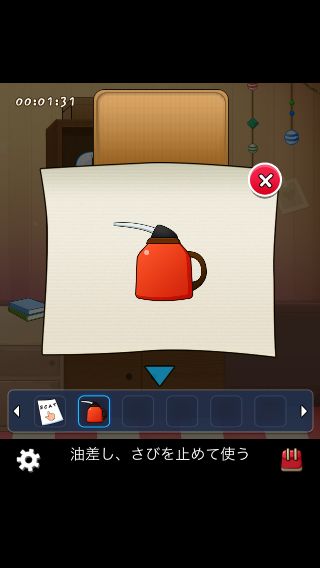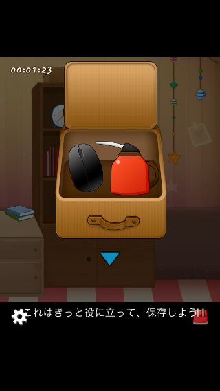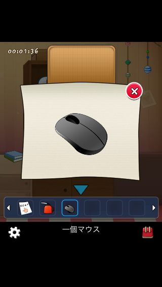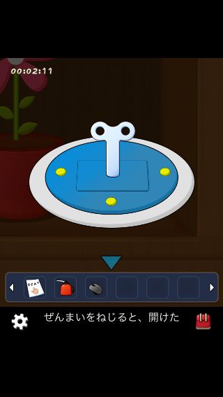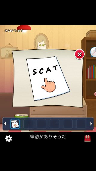 脱出ゲーム「Super Cat」 無料 0 評価する 送信する 攻略その1 スタートしたら、モニターの横の本を調べる。 本の間から「白紙」を入手。 左のインクを拡大して、「羽ペン」を入手。 「白紙」に「羽ペン」を使って、『SCAT』を確認。 右にスクロールして、棚の上の箱を調べる。 中から「油差し」を入手。 「マウス」も入手して、右上の玉を拡大。 中から「ぜんまい」を入手。 棚の中のUFOのオルゴールを拡大して、裏返す。 「ぜんまい」を差し込んで開ける。 攻略その1 攻略その2 攻略その3