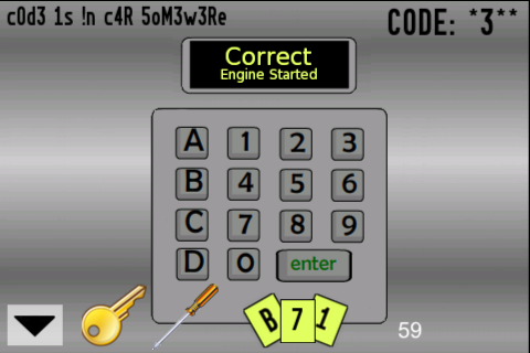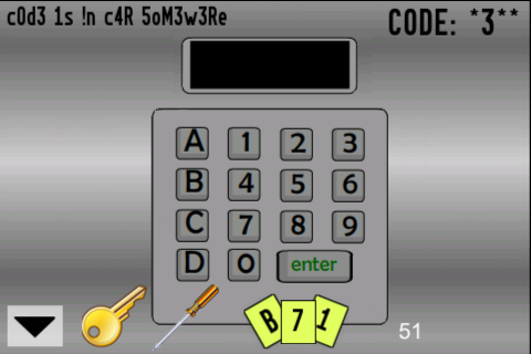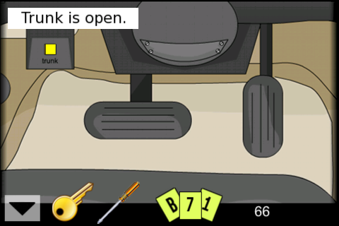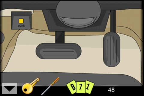 ESCAPE THE CAR - FREE 無料 0 評価する 送信する 攻略その2 ハンドルの下へ移動。 アクセル・ブレーキの上部分を「ドライバー」で開けると暗号入力装置がある。 右上の「CODE:*3**」がヒント。「*」の部分に3枚のカードを割り当てて入力する。 左上のトランクを開けるボタンを押す。 トランクへ戻ると、ここから脱出。 攻略その1 攻略その2