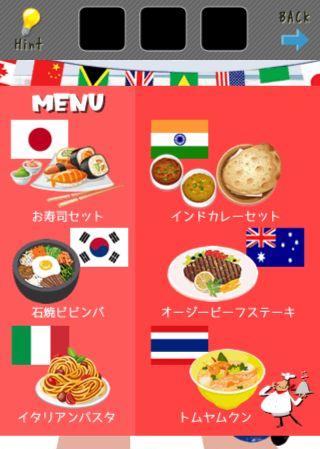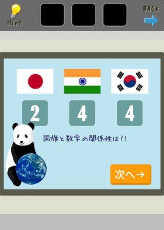 脱出ゲームファミレス 無料 0 評価する 送信する STAGE 11~12 STAGE 11 テーブルのメニューを拡大。 各国旗を確認。 右に移動して、レジのモニターを拡大。 数字の法則は、国旗に使われている色の数となる。 計算式は『3×3×3』となるので、『27』に合わせる。 扉をタップする。 STAGE 12 右に移動。 右上の地図をヒントに、各野菜を色分けしていく。 右に移動。 レジのモニターを拡大して、野菜の多かった地域の順で『緑>青>黄』に合わせる。 扉をタップする。 STAGE 1~4 STAGE 5~6 STAGE 7~8 STAGE 9~10 STAGE 11~12 STAGE 13~14 STAGE 15~16 STAGE 17~18 STAGE 19~21 STAGE 22~24 STAGE 25~27 STAGE 28