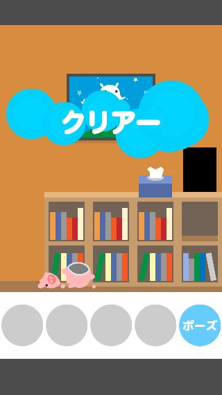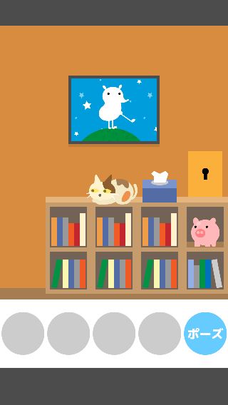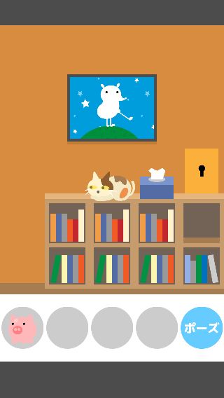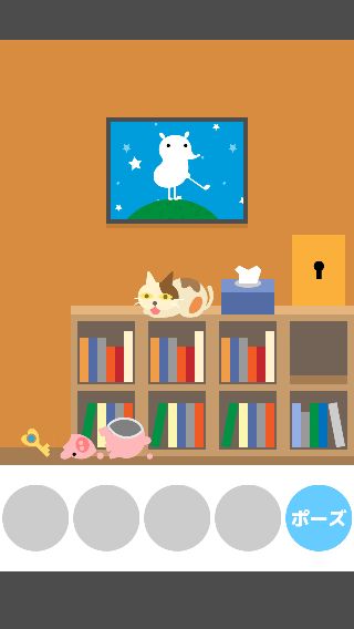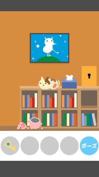 ネコ脱出 無料 5.0 評価する 送信する Ryuji Kuwaki 13:本棚の部屋 本棚から「ブタの貯金箱」を入手。 「ブタの貯金箱」をネコの左に置くと、落として割ってしまう。 「カギ」を入手して、扉に使う。 そのまま出口へ向かう。 1:最初の部屋 2:カギの部屋 3:箱の部屋その1 4:ソファーの部屋 5:箱の部屋その2 6:のどかな部屋 7:勉強部屋 8:スーツの部屋 9:明るい部屋 10:テレビの部屋 11:金魚の部屋 12:迷子の部屋 13:本棚の部屋 14:コロコロの部屋 15:いない部屋 16:地下の部屋 17:セレブの部屋 18:みどりの部屋 19:箱の部屋その3 20:花の部屋 21:こたつの部屋 22:星のみえる部屋 23:ボロの部屋 24:つぼの部屋 25:そうじの部屋 26:プレゼントの部屋 27:ベッドルーム 28:暗い部屋 29:戦いの部屋 30:バスルーム 31:ボロボロの部屋 32:リビングルーム
