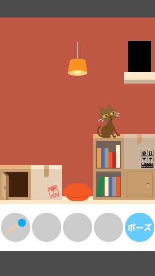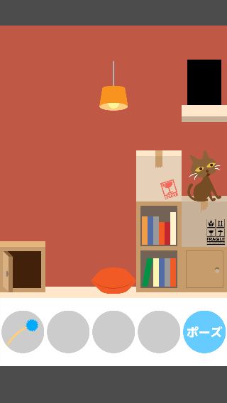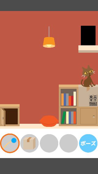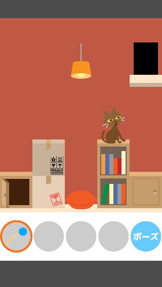 ネコの左に「ダンボール」を置いて、「ねこじゃらし」で出口まで誘導する。
