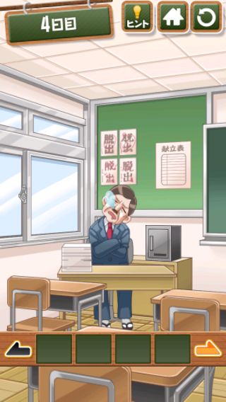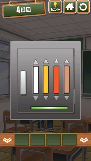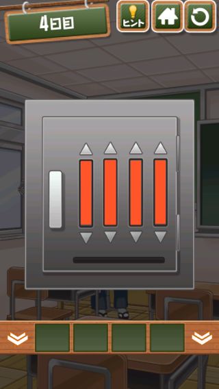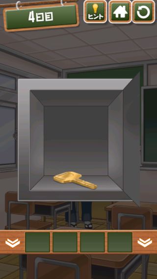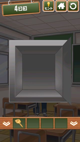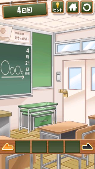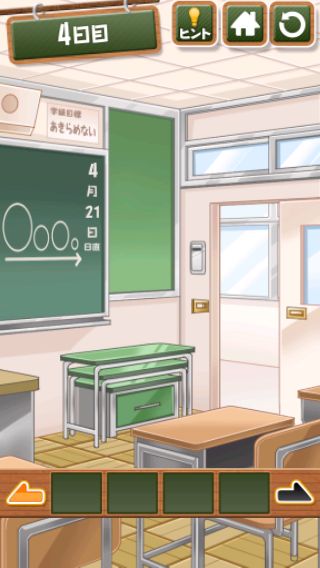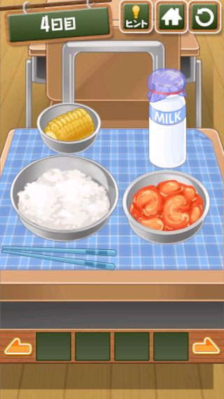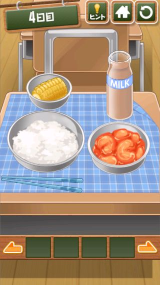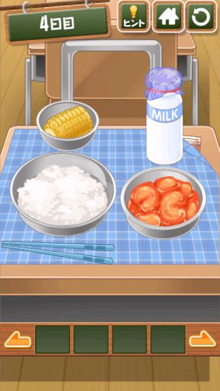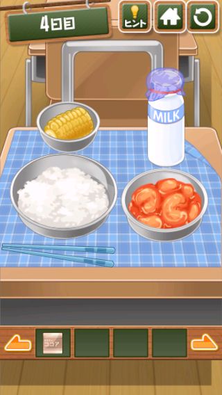 脱出ゲーム 給食からの脱出 無料 4.7 評価する 送信する 4日目 右上をめくる。 「ココア」を入手して、牛乳に入れる。 右に移動して、黒板に書かれた○の大きさの順で給食を並べると『ごはん→トウモロコシ→エビチリ→ココア』の順になる。 左に2回移動。 金庫を拡大して、『ごはん→トウモロコシ→エビチリ→ココア』の色に合わせる。 中から「カギ」を入手。 右に2回移動して、扉に「カギ」を使う。 扉を開ける。 1日目 2日目 3日目 4日目 5日目 6日目 7日目 8日目 9日目 10日目