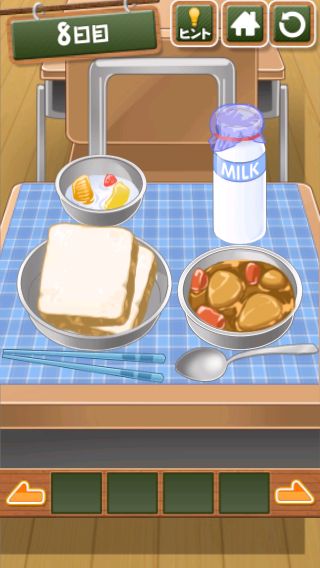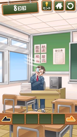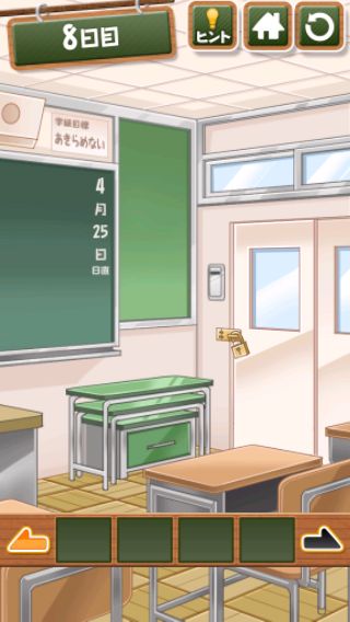脱出ゲーム 給食からの脱出 無料 4.7 評価する 送信する 8日目 左に移動。 窓を開けて、少し待つと先生のヅラが落ちる。 ヅラの中から「カギ」を入手。 右に2回移動して、扉に「カギ」を使う。 扉を開ける。 1日目 2日目 3日目 4日目 5日目 6日目 7日目 8日目 9日目 10日目