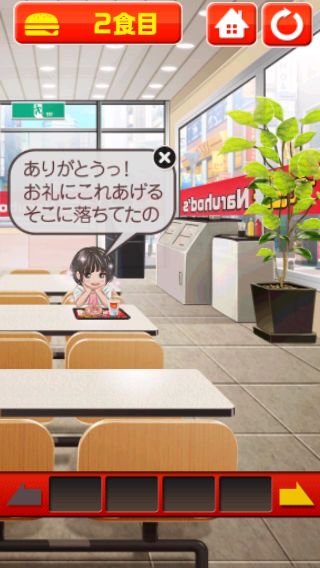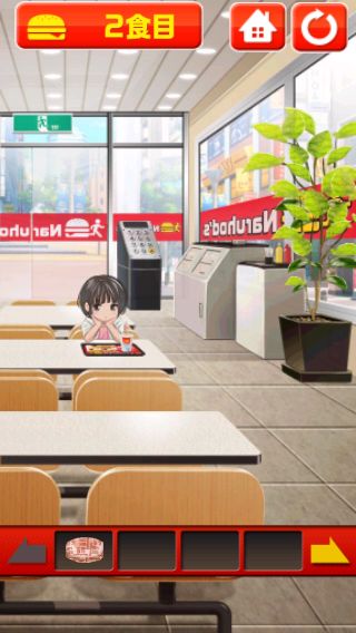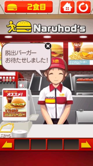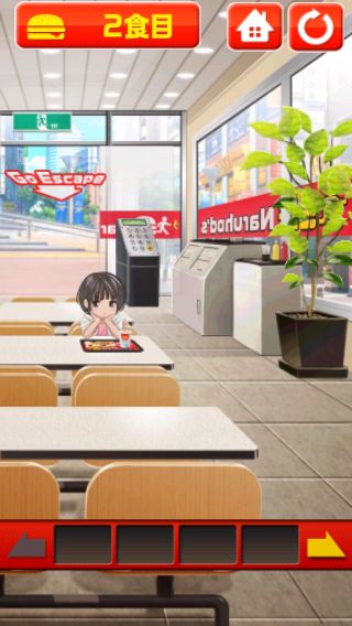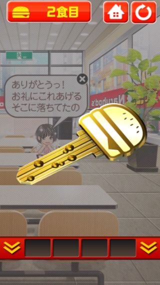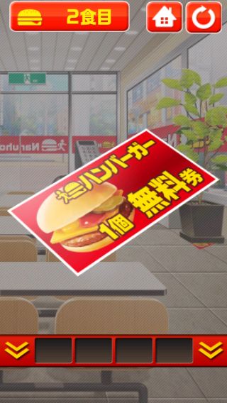 脱出ゲーム バーガーショップからの脱出 無料 5.0 評価する 送信する 2食目 左に移動。 植木の下から「ハンバーガー無料券」を入手して、右に移動。 店員に「ハンバーガー無料券」を渡して、右に移動。 「バーガー」を入手して、左に2回移動。 子供に「バーガー」を渡して、「カギ」を入手。 奥の装置を拡大して、「カギ」を使う。 自動ドアを開ける。 1食目 2食目 3食目 4食目 5食目 6食目 7食目 8食目 9食目 10食目