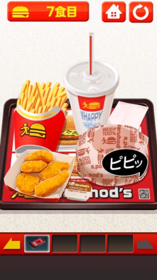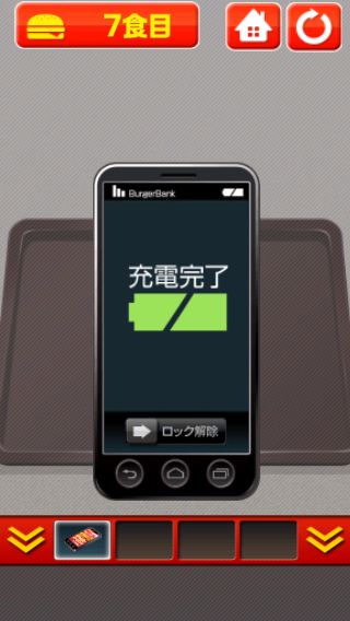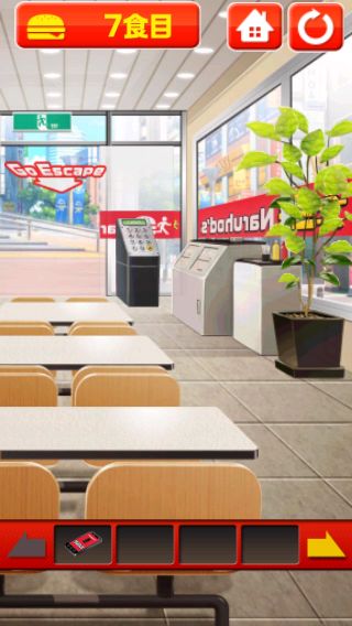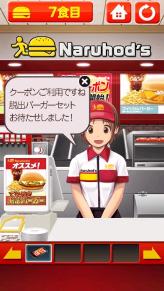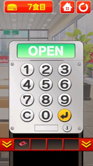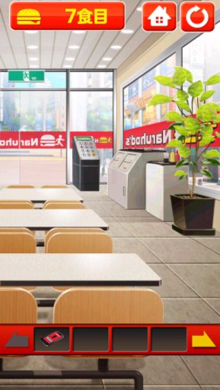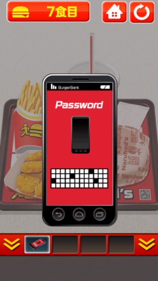 脱出ゲーム バーガーショップからの脱出 無料 5.0 評価する 送信する 7食目 右に移動。 「スマートフォン」を入手して、タップして電源を入れる。 左に移動して、店員に「スマートフォン」を使う。 右に移動して、トレイの右下のQRコードに「スマートフォン」を使う。 表示されたパスワードの画面の下の図形を、『縦4、横3』で区切って黒い部分の場所を覚えておく。 左に2回移動して、奥の装置を拡大。 先ほど区切った『縦4、横3』の中の黒い部分を、キーパッドのボタンに当てはめる。 左から『7537』となるので入力する。 自動ドアを開ける。 1食目 2食目 3食目 4食目 5食目 6食目 7食目 8食目 9食目 10食目