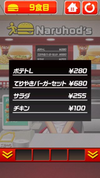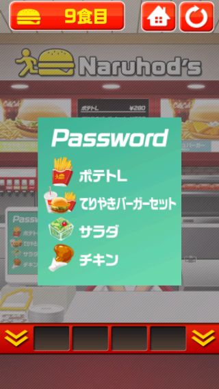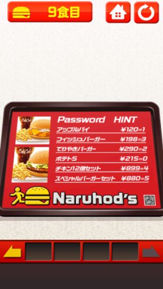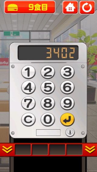 脱出ゲーム バーガーショップからの脱出 無料 5.0 評価する 送信する 9食目 右に移動して、トレイの暗号を確認。 値段の数字の中の囲まれた部分の数を表している。 左に移動して、モニターでパスワードの順番を確認。 奥のメニューで値段の数字の中の囲まれた部分の数を導き出すと、『3、4、0、2』になる。 左に移動して、奥の装置を拡大。 『3402』を入力する。 自動ドアを開ける。 1食目 2食目 3食目 4食目 5食目 6食目 7食目 8食目 9食目 10食目