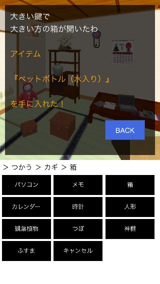 『つかう』>『カギ』>『箱』の順で選択して、「ペットボトル(水入り)」を入手。