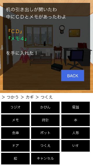 『つかう』>『カギ』>『つくえ』の順で選択して、「CD」と「メモ4」を入手。