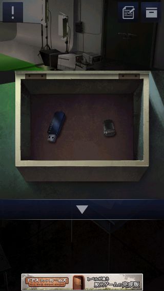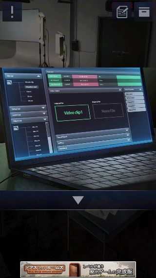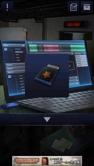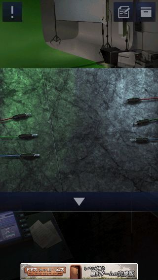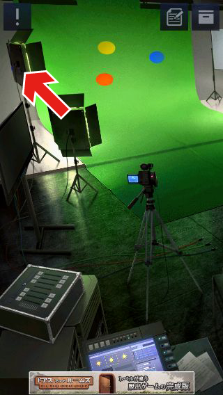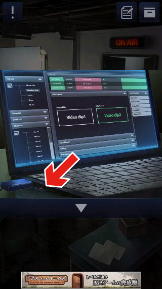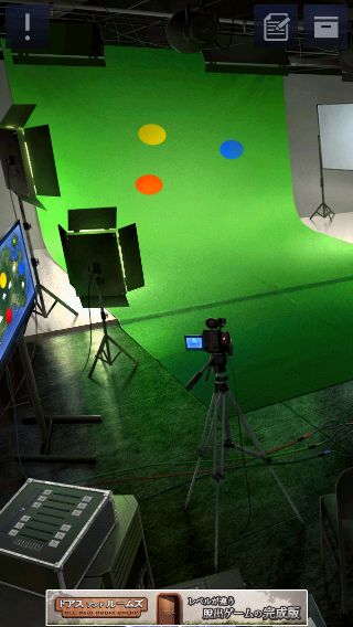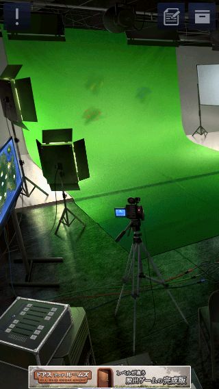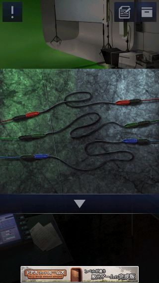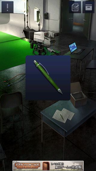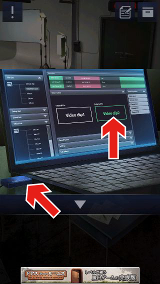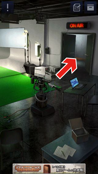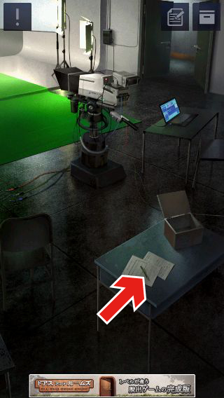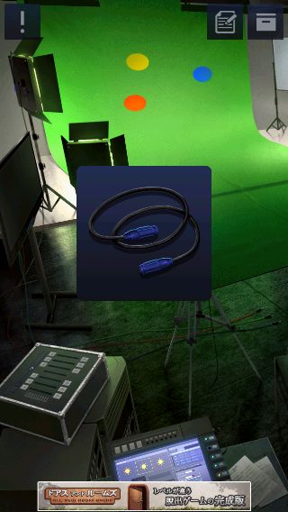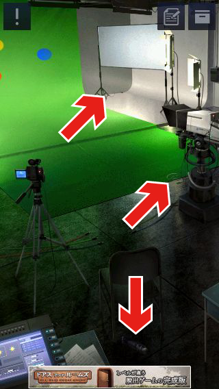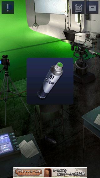 奥のホワイトボードから「赤いケーブル」、右のカメラの下から「緑のケーブル」、椅子の下から「スプレー」を入手。