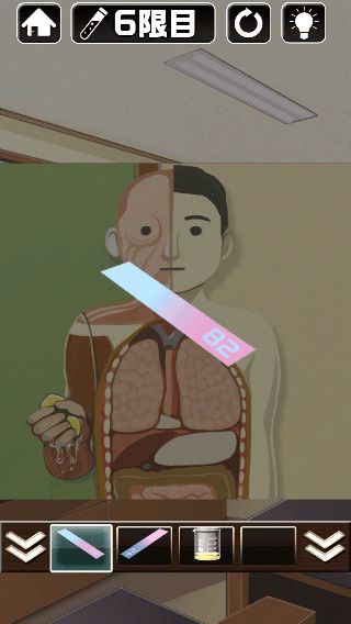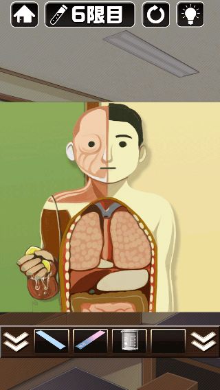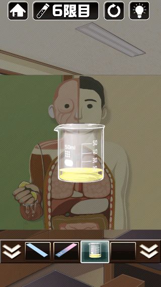 人体模型を拡大して、右手のレモン汁を「ビーカー」に入れる。