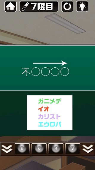 先ほどの色の順で衛星の名前を並びかえると、『イオ→エウロパ→ガニメデ→カリスト』となる。