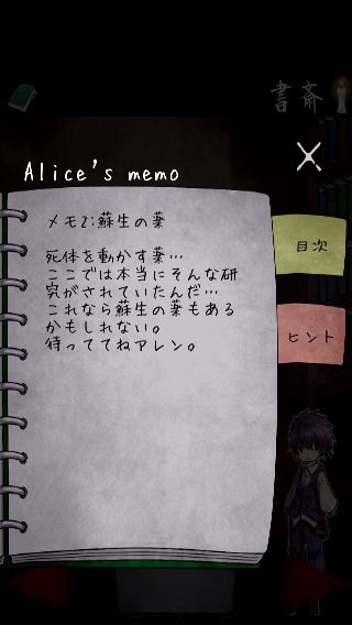 脱出ゲーム 吸血鬼の棲む館 -room escape game- 無料 5.0 評価する 送信する 攻略その2 「書斎」 左から3冊目の研究書を開く。 「アリスのメモ」を入手。 右に移動して、赤い本をタップで全て奥に入れる。 上から『3段目、1段目、5段目、7段目、4段目』の順でタップする。 シャンデリアが降りてきて、「倉庫の鍵」を入手。 右に移動して、扉を開ける。 攻略その1 「小部屋」 攻略その2 「書斎」 攻略その3 「倉庫」 攻略その4 「1の部屋」 攻略その5 「3の部屋」 攻略その6 「中央部屋:前半」 攻略その7 「中央部屋:後半」 攻略その8 「ピアノ部屋:前半」 攻略その9 「ピアノ部屋:後半」 攻略その10 「銅像部屋」 攻略その11 「4の部屋:前半」 攻略その12 「4の部屋:後半」 攻略その13 「浴室」 攻略その14 「暖炉部屋」 攻略その15 「食堂:前半」 攻略その16 「食堂:後半」 攻略その17 「キッチン:前半」 攻略その18 「キッチン:後半」 攻略その19 「2の部屋」 攻略その20 「隠し部屋」 攻略その21 「棺桶部屋:前半」 攻略その22 「棺桶部屋:後半」 攻略その23 「最後の部屋」