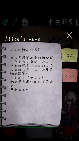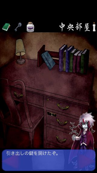 脱出ゲーム 吸血鬼の棲む館 -room escape game- 無料 5.0 評価する 送信する 攻略その6 「中央部屋:前半」 時計を拡大して、『10:09』を確認。 左に移動して、「アリスのメモ」を入手。 2段目の引き出しを拡大して、『1009』に合わせる。 中から「ドライバー」を入手。 右に移動して、時計を拡大。 3時の位置にあるネジを「ドライバー」で外して、文字盤を開ける。 中央から「どこかの鍵」を入手して、右に移動。 左下のハッチを拡大して、右にスライドさせる。 「歯車」を入手して、反対側に移動。 上の引き出しに「どこかの鍵」を使って、中の『NEWNESS』を確認。 攻略その1 「小部屋」 攻略その2 「書斎」 攻略その3 「倉庫」 攻略その4 「1の部屋」 攻略その5 「3の部屋」 攻略その6 「中央部屋:前半」 攻略その7 「中央部屋:後半」 攻略その8 「ピアノ部屋:前半」 攻略その9 「ピアノ部屋:後半」 攻略その10 「銅像部屋」 攻略その11 「4の部屋:前半」 攻略その12 「4の部屋:後半」 攻略その13 「浴室」 攻略その14 「暖炉部屋」 攻略その15 「食堂:前半」 攻略その16 「食堂:後半」 攻略その17 「キッチン:前半」 攻略その18 「キッチン:後半」 攻略その19 「2の部屋」 攻略その20 「隠し部屋」 攻略その21 「棺桶部屋:前半」 攻略その22 「棺桶部屋:後半」 攻略その23 「最後の部屋」