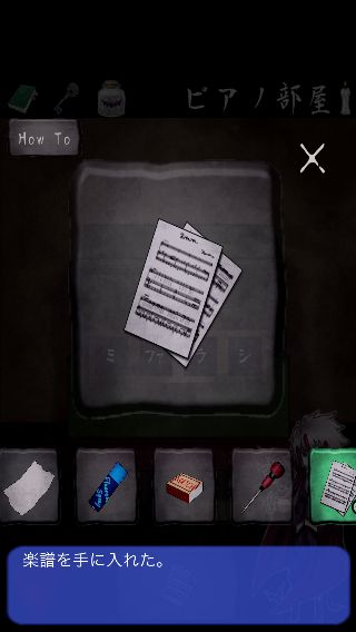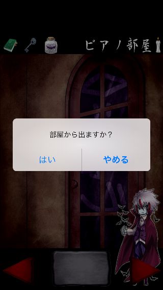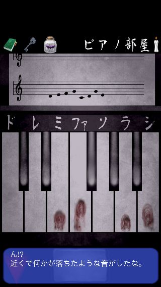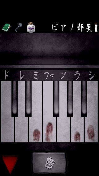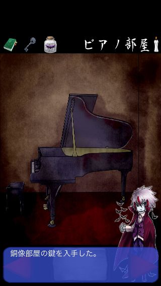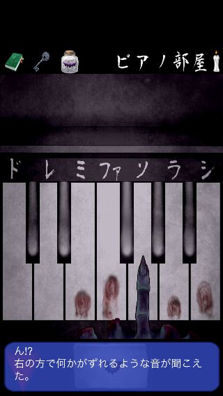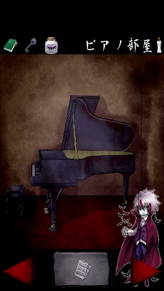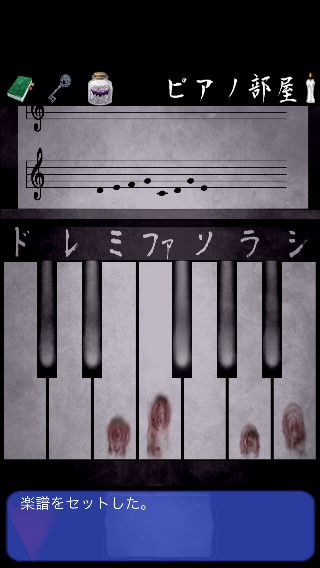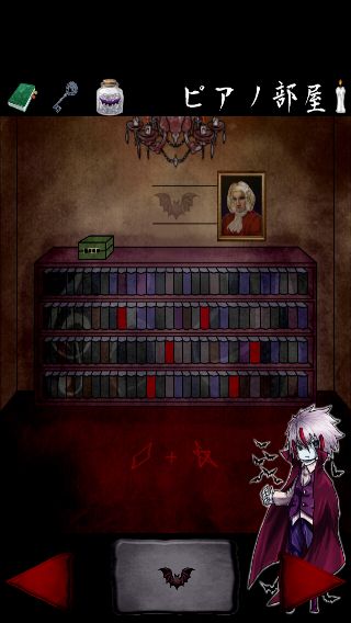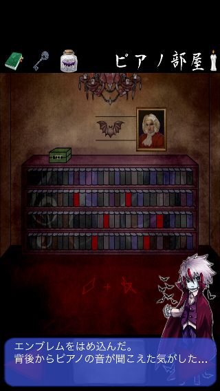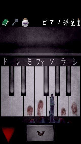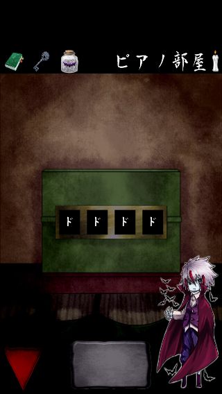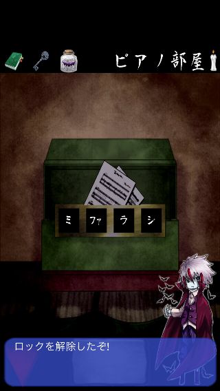 脱出ゲーム 吸血鬼の棲む館 -room escape game- 無料 5.0 評価する 送信する 攻略その9 「ピアノ部屋:後半」 左に移動して、鍵盤を拡大。 『ラレファラレファ』の順で弾いて、右に移動。 鍵盤の血痕の位置『ミファラシ』を覚えておく。 壁に「蝙蝠型のエンブレム」をはめて、緑の箱を拡大。 『ミファラシ』に合わせて、「楽譜」を入手。 左に移動して、鍵盤を拡大。 「楽譜」を置いて、『レミファソドレソミ』の順で弾く。 床から「銅像部屋の鍵」を入手。 左に移動して、扉を開ける。 攻略その1 「小部屋」 攻略その2 「書斎」 攻略その3 「倉庫」 攻略その4 「1の部屋」 攻略その5 「3の部屋」 攻略その6 「中央部屋:前半」 攻略その7 「中央部屋:後半」 攻略その8 「ピアノ部屋:前半」 攻略その9 「ピアノ部屋:後半」 攻略その10 「銅像部屋」 攻略その11 「4の部屋:前半」 攻略その12 「4の部屋:後半」 攻略その13 「浴室」 攻略その14 「暖炉部屋」 攻略その15 「食堂:前半」 攻略その16 「食堂:後半」 攻略その17 「キッチン:前半」 攻略その18 「キッチン:後半」 攻略その19 「2の部屋」 攻略その20 「隠し部屋」 攻略その21 「棺桶部屋:前半」 攻略その22 「棺桶部屋:後半」 攻略その23 「最後の部屋」