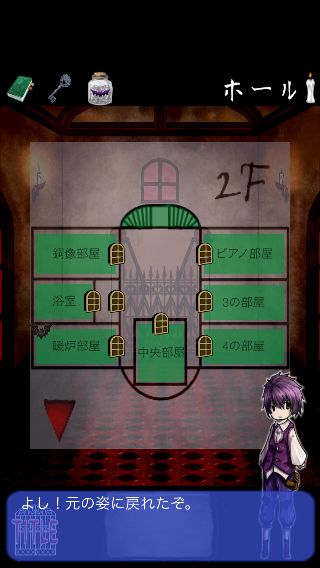 「吸血鬼化の薬」で人間に戻って、部屋に入る。