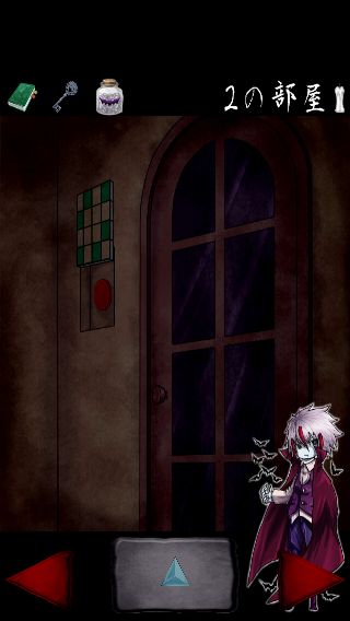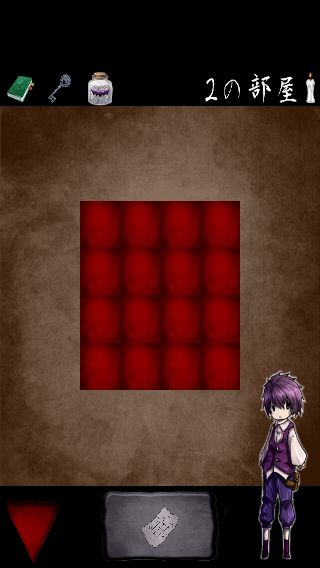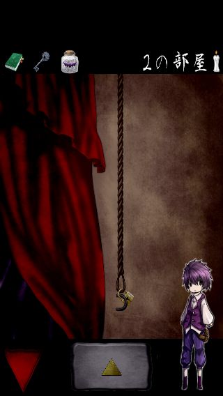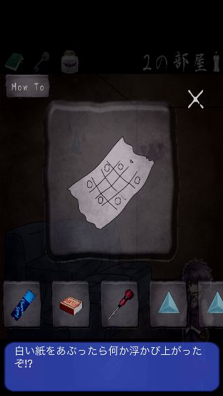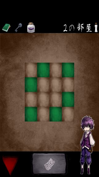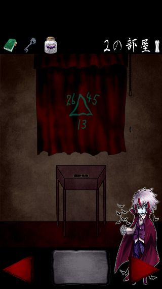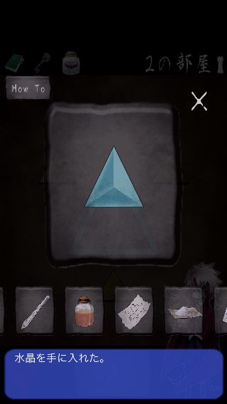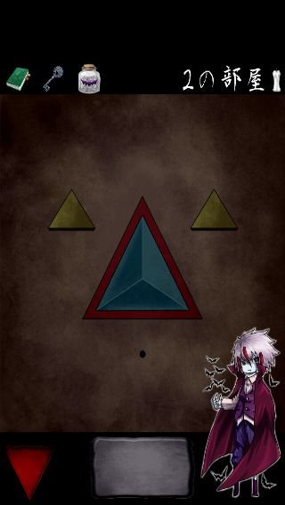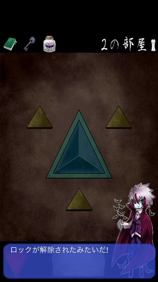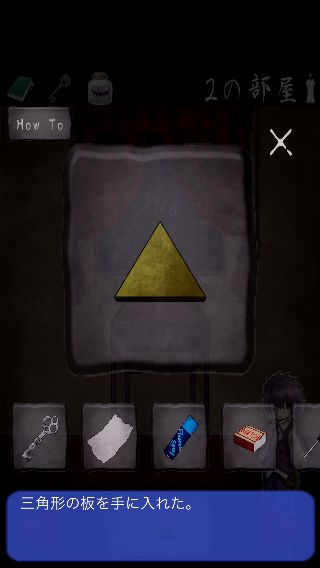 「三角形の板」を取り付けて、カーテンのヒントから『下、左上、下、右上、右上、左上』の順で押す。