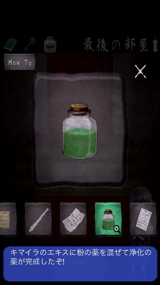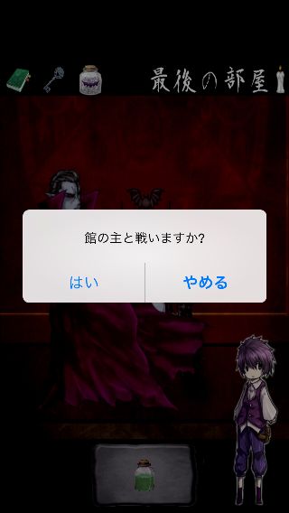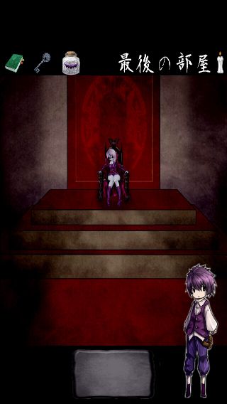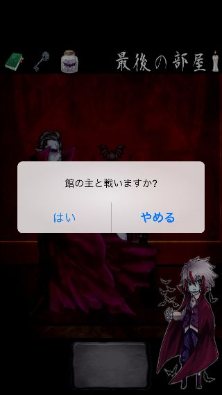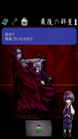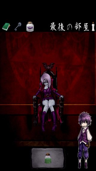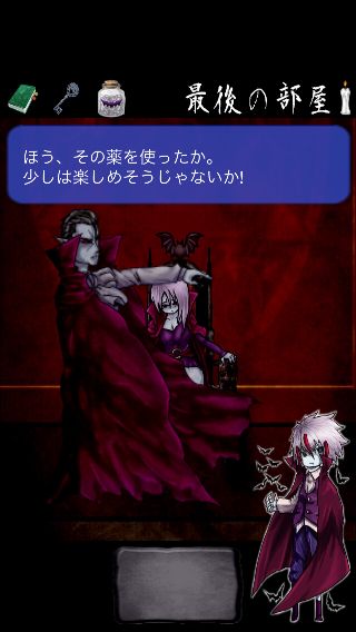脱出ゲーム 吸血鬼の棲む館 -room escape game- 無料 5.0 評価する 送信する 攻略その23 「最後の部屋」 「キマイラのエキス」を取り出す。 「謎の粉末」を混ぜて、「浄化の薬」を入手。 ※ エンディング1『TRUE END』の条件。 正面の人物を調べる。 館の主が現れる。 主との戦いで『やめる』を選択する。 「吸血鬼化の薬」で変身してから、主と戦ってエンディングへ。 ※ 戦闘中に「浄化の薬」を使わないと、エンディング2へ。 ※ 隠し部屋でチェーンを「南京錠」で固定していないと、エンディング3へ。 ※ 「銀のナイフ」を取得していないと、エンディング4へ。 攻略その1 「小部屋」 攻略その2 「書斎」 攻略その3 「倉庫」 攻略その4 「1の部屋」 攻略その5 「3の部屋」 攻略その6 「中央部屋:前半」 攻略その7 「中央部屋:後半」 攻略その8 「ピアノ部屋:前半」 攻略その9 「ピアノ部屋:後半」 攻略その10 「銅像部屋」 攻略その11 「4の部屋:前半」 攻略その12 「4の部屋:後半」 攻略その13 「浴室」 攻略その14 「暖炉部屋」 攻略その15 「食堂:前半」 攻略その16 「食堂:後半」 攻略その17 「キッチン:前半」 攻略その18 「キッチン:後半」 攻略その19 「2の部屋」 攻略その20 「隠し部屋」 攻略その21 「棺桶部屋:前半」 攻略その22 「棺桶部屋:後半」 攻略その23 「最後の部屋」