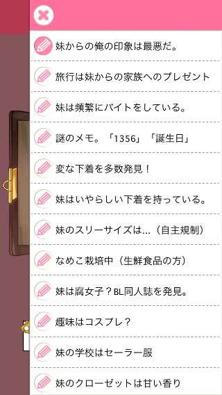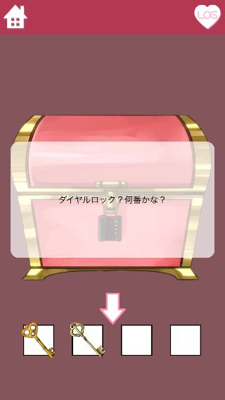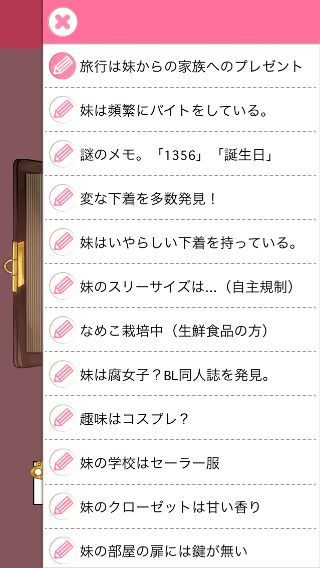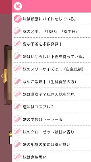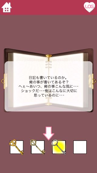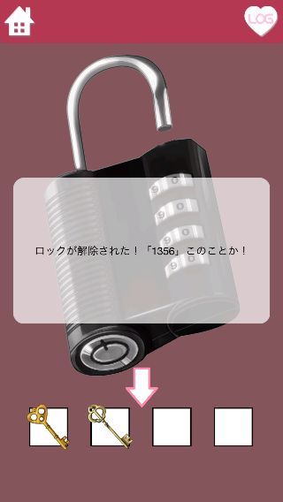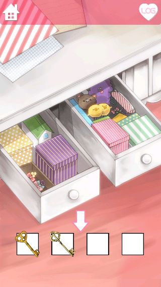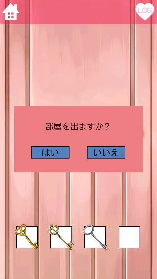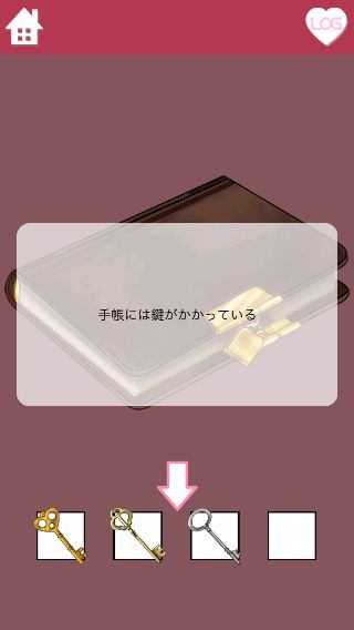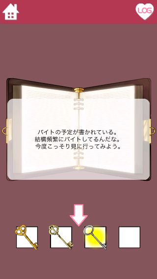 妹の部屋~勝手に触っちゃいけません!~ 無料 5.0 評価する 送信する 攻略その5 右に移動して、机の引き出しを調べる。 左の引き出しの奥の箱を調べる。 『1356』を入力して、箱の中から「カギ」を入手。 右の引き出しにある手帳を調べる。 「カギ」で開けて、『妹は頻繁にバイトをしている。』を達成。 さらに調べて、『旅行は妹からの家族へのプレゼント』を達成。 さらに調べて、『妹からの俺の印象は最悪だ。』を達成。 出口から脱出して、エンディングへ。 攻略その1 攻略その2 攻略その3 攻略その4 攻略その5