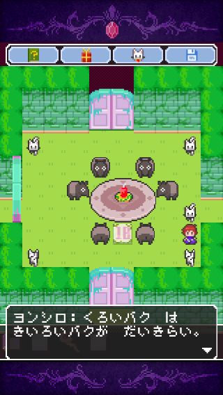 脱出ゲーム「黒猫は勇者の夢を見るか?」 無料 5.0 評価する 送信する HappyHoppyHappy Co.,Ltd. 18番の部屋 4匹のネコと話して、ヒントを確認。 バクの色を左上から時計回りに、『黒、紫、ピンク、白、黄、赤』に合わせて、中央のロウソクに「まほうのつえ」で火をつける。 「くろいカギ」を入手。 上の扉に「くろいカギ」を使う。 フロア攻略 1番の部屋 2番の部屋 15番の部屋 4番の部屋 7番の部屋 12番の部屋 6番の部屋 19番の部屋 8番の部屋 20番の部屋 11番の部屋 18番の部屋 17番の部屋 13番の部屋 10番の部屋 5番の部屋 16番の部屋 14番の部屋 9番の部屋 3番の部屋 21番の部屋 その1 21番の部屋 その2 21番の部屋 その3 21番の部屋 その4 22番の部屋 スライドパズル攻略 パターン1 その1 パターン1 その2 パターン2 その1 パターン2 その2 パターン2 その3 パターン3 その1 パターン3 その2 パターン3 その3 パターン4 その1 パターン4 その2 達成項目 攻略その1 攻略その2 攻略その3 攻略その4 攻略その5 迷路の地図 1つ目の迷路 2つ目の迷路 3つ目の迷路 4つ目の迷路 5つ目の迷路 6つ目の迷路 7つ目の迷路