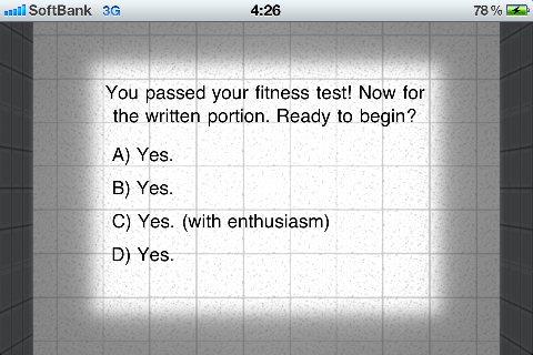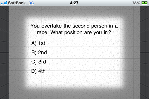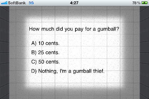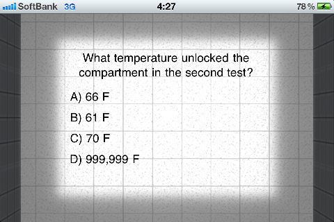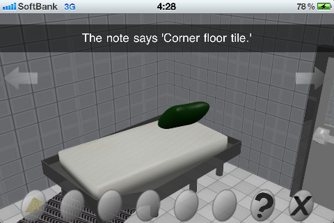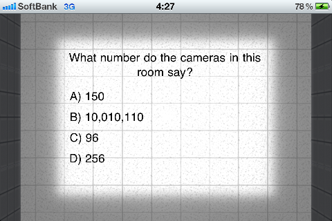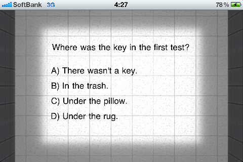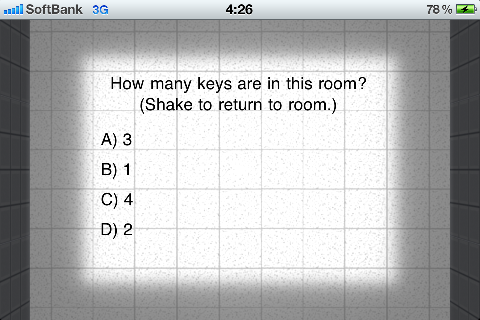 Rynx Escape the Room 無料 0 評価する 送信する 攻略その7 iPhoneを振ると質問画面に移動。最初の質問は『C』次の質問は『A』が正解。 3つ目の質問は『C』、4つ目は『D』。 5つ目は『B』、6つ目は『D』。 7つ目は『A』、8つ目は『D』。 9つ目は『B』、最後の質問は『A』。 全て答えると脱出。 Room 10 いよいよ最後の部屋。最初の部屋が元になっている。 枕を持ち上げる。 「メモ」を入手して読む。 右に移動して、「メモ」に書いてあったとおりにコーナーのタイルをめくって「安全ピン」を入手。 攻略その1 攻略その2 攻略その3 攻略その4 攻略その5 攻略その6 攻略その7 攻略その8