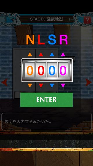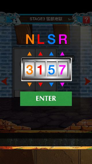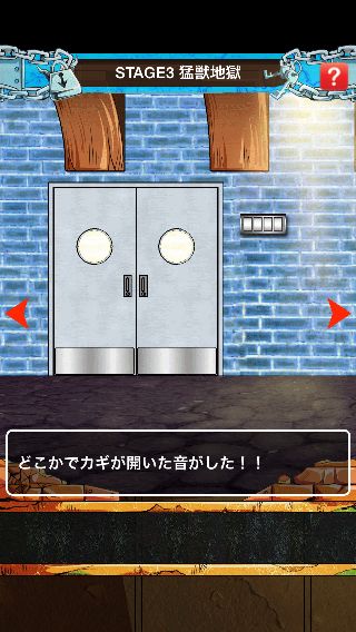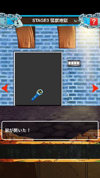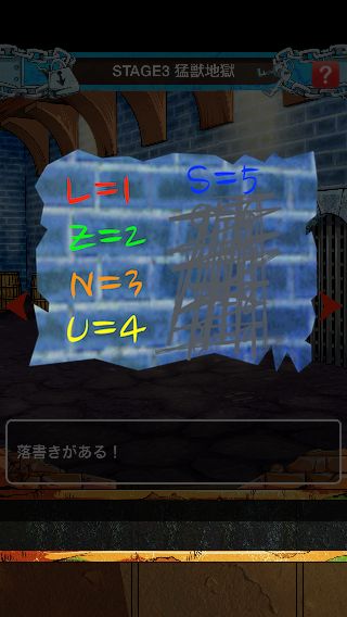海底監獄インペルダウンからの脱出 無料 0 評価する 送信する STAGE 3 猛獣地獄 右に移動。 中央の壁の暗号を確認して、右に2回移動。 右下の壁の暗号を確認して、左に移動。 壁の装置を拡大。 ヒントの暗号から『3157』に合わせる。 扉を開ける。 「ブルゴリの笛」を入手して、左に2回移動。 「ブルゴリの笛」を使う。 STAGE 1 地上-監獄入口 STAGE 2 紅蓮地獄 STAGE 3 猛獣地獄 STAGE 4 飢餓地獄 STAGE 5 焦熱地獄 STAGE 6 極寒地獄 STAGE 7 Nカマランド STAGE 8 無限地獄
