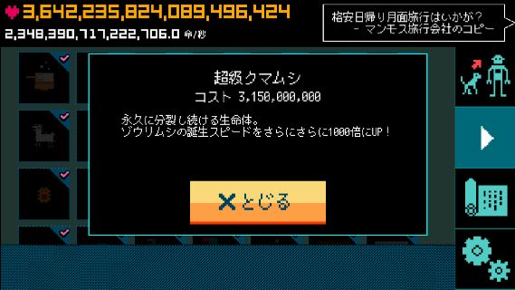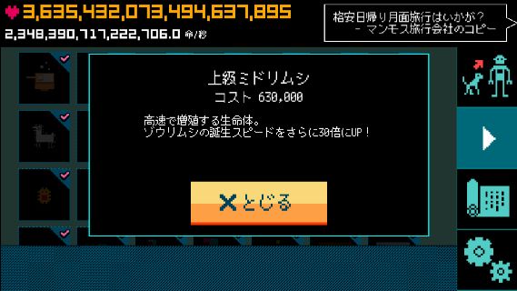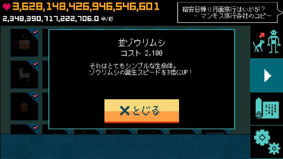 ぼくの惑星~どんど来い!アルマゲドン~ 無料 5.0 評価する 送信する HappyHoppyHappy Co.,Ltd. ゾウリムシ誕生スピードアップ 並ゾウリムシ 上級ミドリムシ 超級クマムシ 文明一覧 ライフタップ 箱舟 オール 生命体増加率アップ ゾウリムシ誕生スピードアップ アンモナイト誕生スピードアップ 恐竜誕生スピードアップ 始祖鳥誕生スピードアップ マンモス誕生スピードアップ ホモ・サピエンス誕生スピードアップ 石油誕生スピードアップ 電気誕生スピードアップ ロケット誕生スピードアップ 宇宙ステーション誕生スピードアップ アンドロイド誕生スピードアップ 超人類誕生スピードアップ アルマゲドン 達成項目一覧 惑星レベルアップ 最初の進化 進化の引き継ぎ アルマゲドン タップ・UFO・箱舟 拓けた文明 突然変異種 その他実績