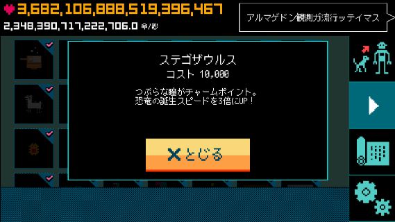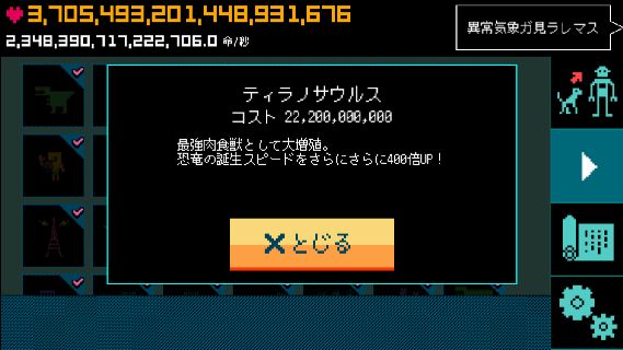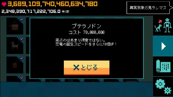 ぼくの惑星~どんど来い!アルマゲドン~ 無料 5.0 評価する 送信する HappyHoppyHappy Co.,Ltd. 恐竜誕生スピードアップ ステゴザウルス プテラノドン ティラノサウルス 文明一覧 ライフタップ 箱舟 オール 生命体増加率アップ ゾウリムシ誕生スピードアップ アンモナイト誕生スピードアップ 恐竜誕生スピードアップ 始祖鳥誕生スピードアップ マンモス誕生スピードアップ ホモ・サピエンス誕生スピードアップ 石油誕生スピードアップ 電気誕生スピードアップ ロケット誕生スピードアップ 宇宙ステーション誕生スピードアップ アンドロイド誕生スピードアップ 超人類誕生スピードアップ アルマゲドン 達成項目一覧 惑星レベルアップ 最初の進化 進化の引き継ぎ アルマゲドン タップ・UFO・箱舟 拓けた文明 突然変異種 その他実績