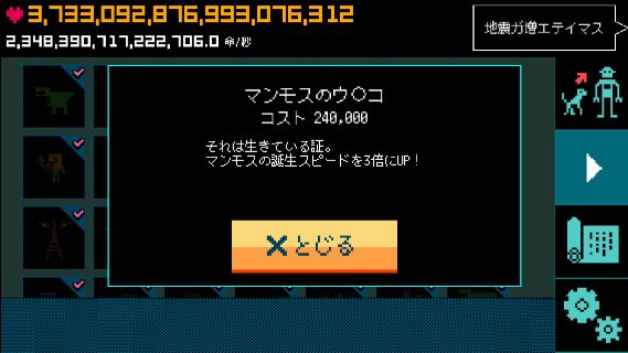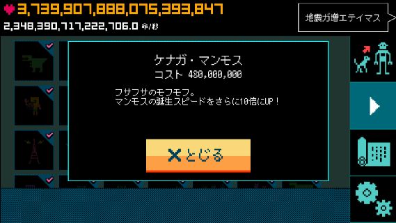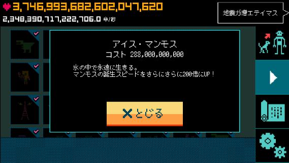 ぼくの惑星~どんど来い!アルマゲドン~ 無料 5.0 評価する 送信する HappyHoppyHappy Co.,Ltd. マンモス誕生スピードアップ マンモスのウ○コ ケナガ・マンモス アイス・マンモス 文明一覧 ライフタップ 箱舟 オール 生命体増加率アップ ゾウリムシ誕生スピードアップ アンモナイト誕生スピードアップ 恐竜誕生スピードアップ 始祖鳥誕生スピードアップ マンモス誕生スピードアップ ホモ・サピエンス誕生スピードアップ 石油誕生スピードアップ 電気誕生スピードアップ ロケット誕生スピードアップ 宇宙ステーション誕生スピードアップ アンドロイド誕生スピードアップ 超人類誕生スピードアップ アルマゲドン 達成項目一覧 惑星レベルアップ 最初の進化 進化の引き継ぎ アルマゲドン タップ・UFO・箱舟 拓けた文明 突然変異種 その他実績