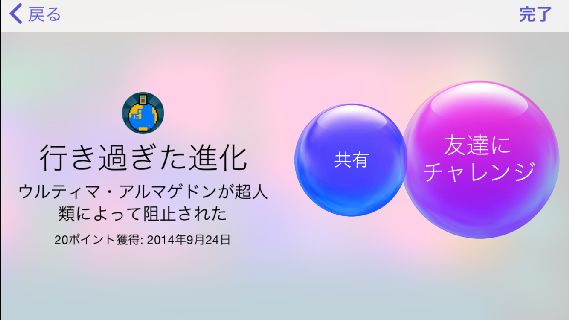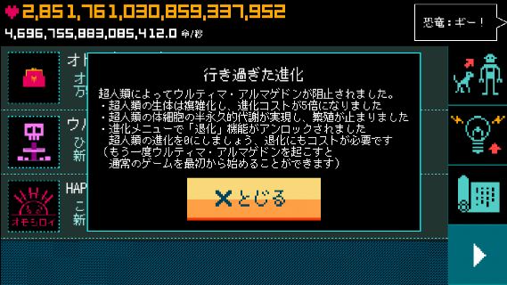 ぼくの惑星~どんど来い!アルマゲドン~ 無料 5.0 評価する 送信する HappyHoppyHappy Co.,Ltd. その他実績 ATCG 二重螺旋 書き換え完了 Look ma, both hands! ミッシング・リンク 特殊相対性理論 最小の努力で最大の効果を T名人 行き過ぎた進化 脅威の排除 全知全能 文明一覧 ライフタップ 箱舟 オール 生命体増加率アップ ゾウリムシ誕生スピードアップ アンモナイト誕生スピードアップ 恐竜誕生スピードアップ 始祖鳥誕生スピードアップ マンモス誕生スピードアップ ホモ・サピエンス誕生スピードアップ 石油誕生スピードアップ 電気誕生スピードアップ ロケット誕生スピードアップ 宇宙ステーション誕生スピードアップ アンドロイド誕生スピードアップ 超人類誕生スピードアップ アルマゲドン 達成項目一覧 惑星レベルアップ 最初の進化 進化の引き継ぎ アルマゲドン タップ・UFO・箱舟 拓けた文明 突然変異種 その他実績