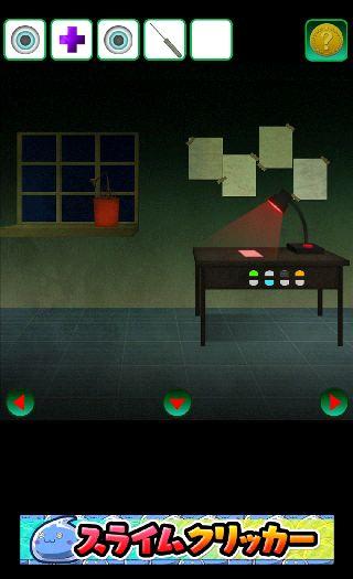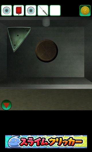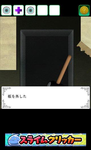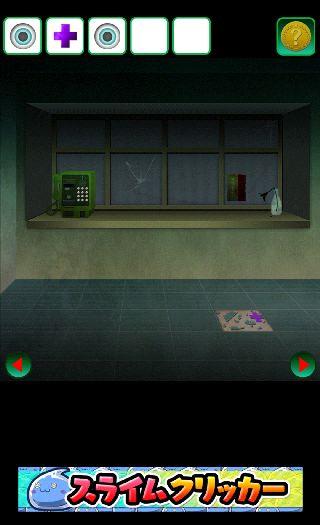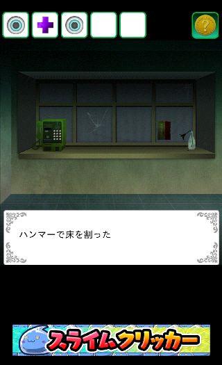 受付の電話機の前に移動して、右下の床に「ハンマー」を使う。