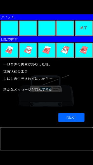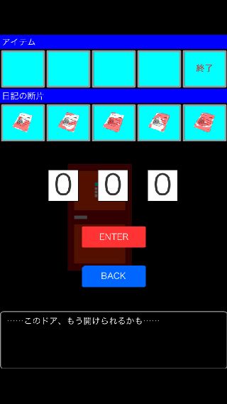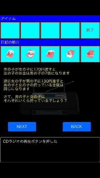 滅ノ檻 無料 0 評価する 送信する 開放エンド【闇色の空へ】 5つの「日記の断片」を読んでから、ラジカセに「CD」を入れる。 問題が表示されたらそのままの状態でしばらく待つと、『NEXT』のボタンが表示される。 扉に3桁の問題の答えを入力してクリアすると、開放エンド【闇色の空へ】。 攻略その1 攻略その2 開放エンド【闇色の空へ】