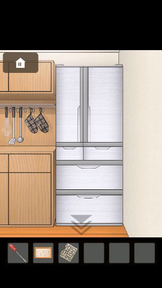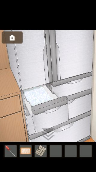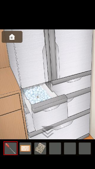 左奥の冷蔵庫を拡大して、製氷室を開ける。