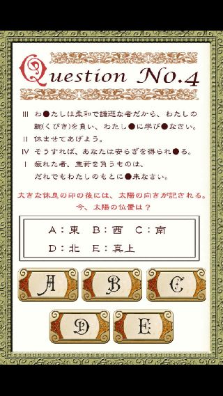 4問目は●の次の文字を数字の順で読んでいくと『来たになる(北になる)』から、『D:北』が正解。