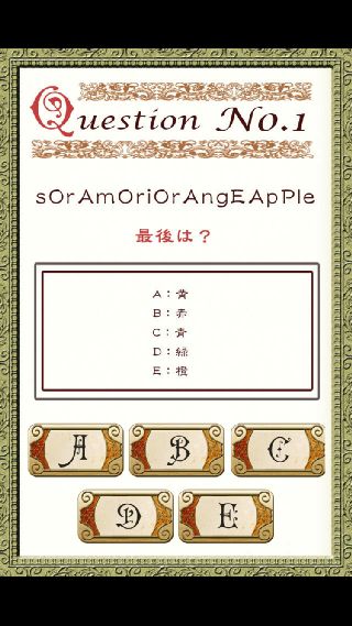 最初の問題は、『空、森、オレンジ、アップル』と読めるので、『B:赤』となる。