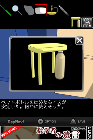 「壊れた小さなイス」を調べ、「ペットボトル」を取り付ける。