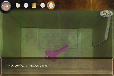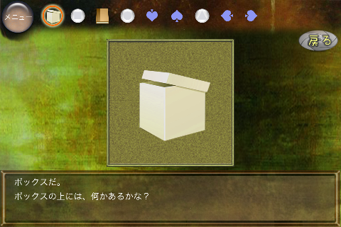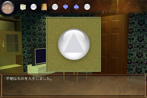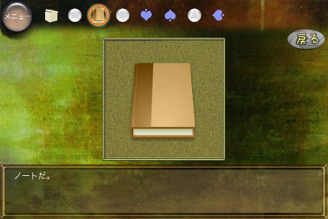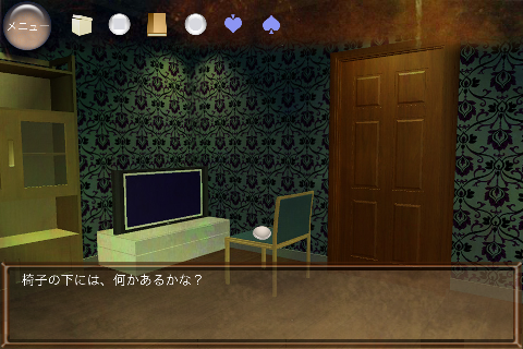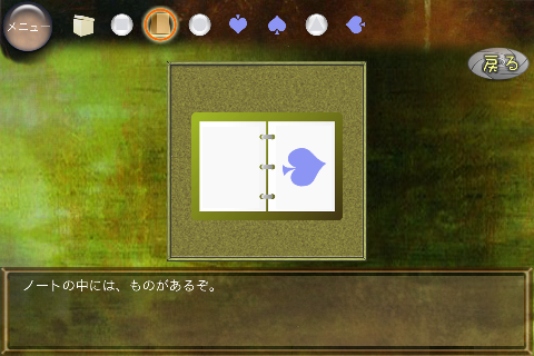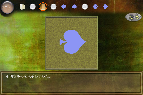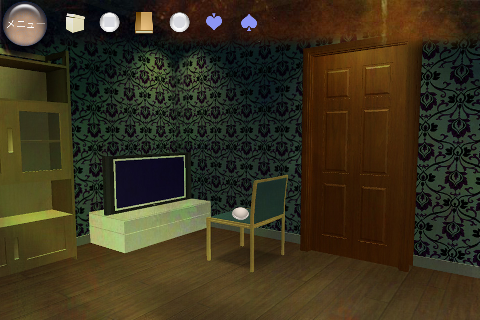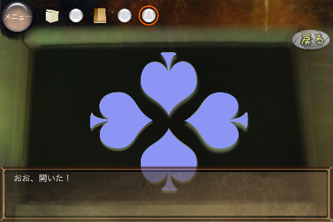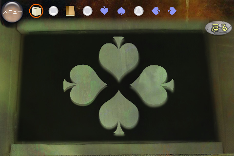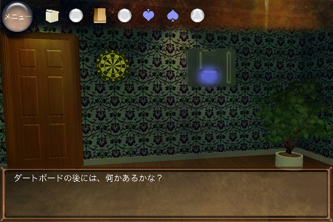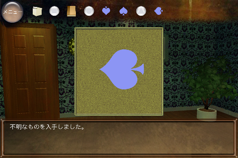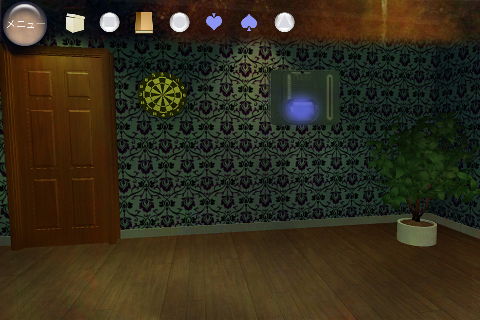 無料 評価する 送信する 攻略その2 右に移動。 椅子の下から「不明なもの(▲の玉)」を入手。 右に移動。 ダーツボードから「不明なもの(左向きスペード)」を入手。 「ノート」を調べる。 右のページを2回めくり、「右向きスペード」を入手。 「ボックス」をタップして調べる。 集めた4種のスペードをはめていく。 中から「鍵」を入手。 大きなキャビネットの前に移動。 普通モード 攻略その1 攻略その2 攻略その3 ハードモード 攻略その1 攻略その2