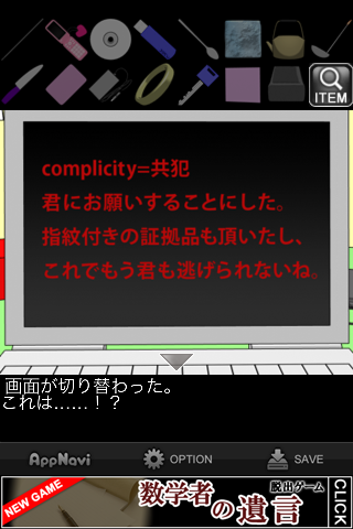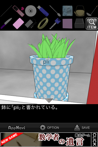 脱出ゲーム "着せられた罪" 無料 0 評価する 送信する IDAC CO.,LTD.(WaveA PTE.LTD.) 攻略その7 『●』はベランダの右の鉢植え。『pli』を確認。 最後の『▲』は、ピンクの引き出しの中の太陽の右側に『.com』と書かれている。 これらを続けて入力して、扉を開いて脱出。 攻略その1 攻略その2 攻略その3 攻略その4 攻略その5 攻略その6 攻略その7