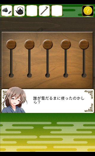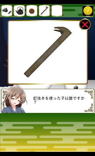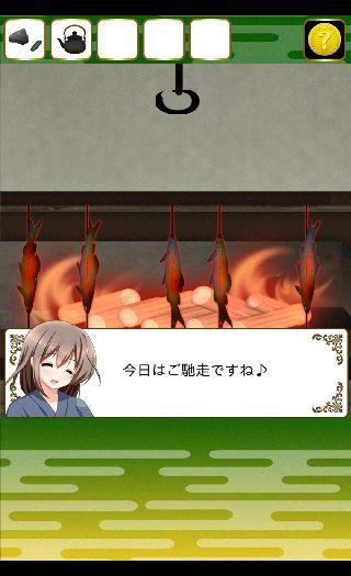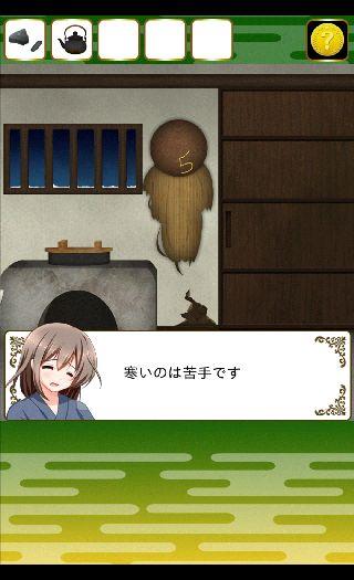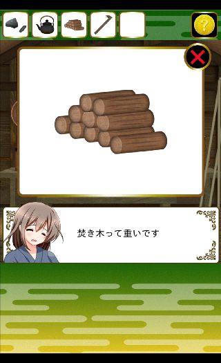 脱出ゲーム 絶対に開けてはいけない鶴の恩返し 無料 0 評価する 送信する 攻略その3 囲炉裏を拡大して、「魚」を使う。 魚の向き『下下上上下』を確認。 右に2回移動して、扉を調べる。 壁の上着をタップして、外に移動。 左の雪だるまの鼻から「丸い木」を入手。 右の雪だるまから「釘抜き」を入手して、右に移動。 扉の装置に「丸い木」をはめる。 先ほどの魚の向き『下下上上下』に合わせて、倉庫の中へ。 「焚き木」を入手して、家の中へ。 かまどに「焚き木」を入れて、「火打ち石」で火をつける。 左に3回移動して、扉をタップしてイベント。 攻略その1 攻略その2 攻略その3 攻略その4 攻略その5 攻略その6