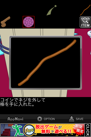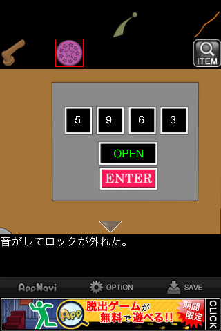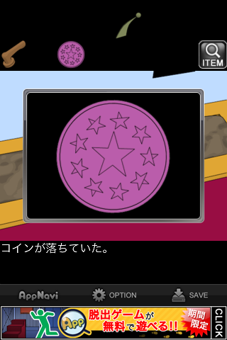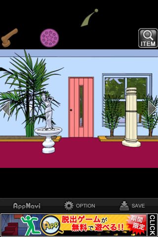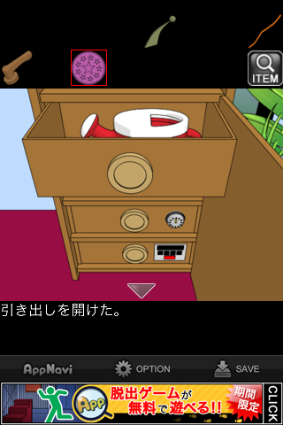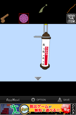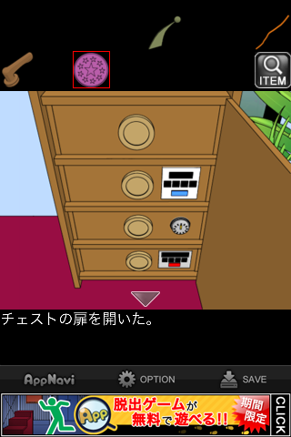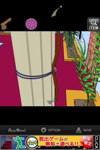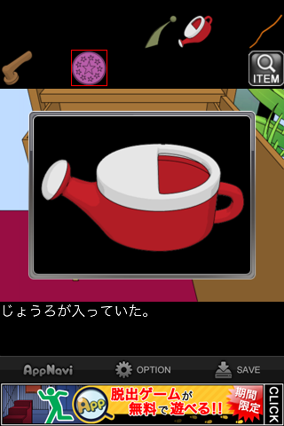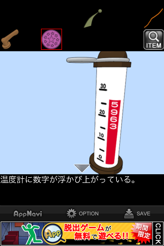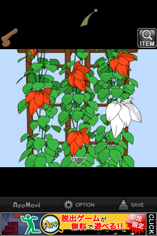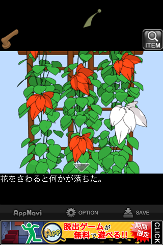 脱出ゲーム "水底の秘密" 無料 0 評価する 送信する 攻略その2 中央の緑のカーテンに近づき、白い花をタップする。 下を調べる。 右の土のところから「紫のコイン」を入手。 スタート地点に戻り、右の柱を調べる。 「コイン」でネジを回して「棒」を入手。 最初に調べた温度計を再度調べると、温度が上がって4桁の数字が現れる。 必ずタップしてメッセージを出す事。 カレンダーのある画面へ。 カレンダー下の金庫を調べる。 金庫に温度計の数字を入力。中から引き出しが現れる。 一番上の引き出しから「じょうろ」を入手。 攻略その1 攻略その2 攻略その3 攻略その4 攻略その5 攻略その6 攻略その7