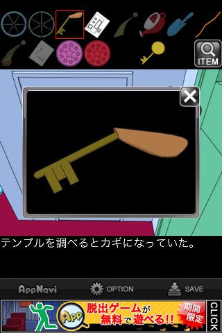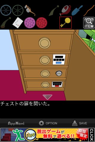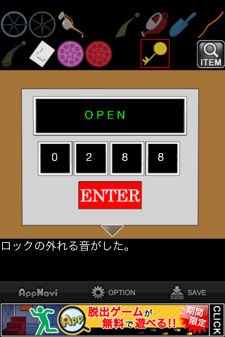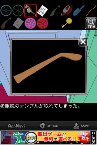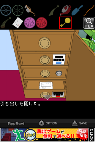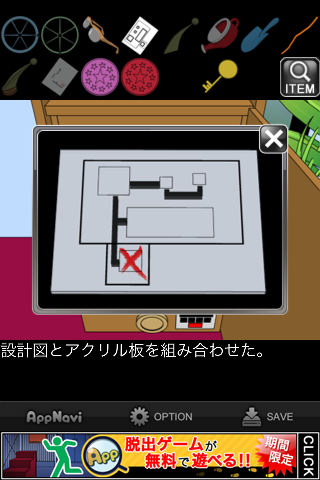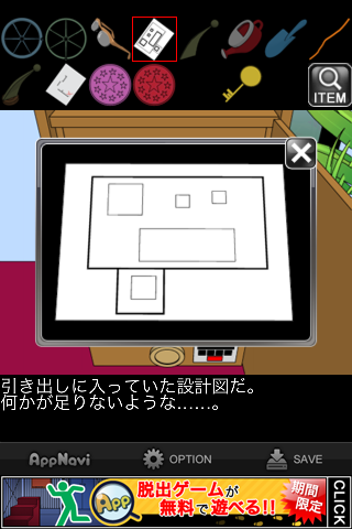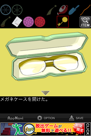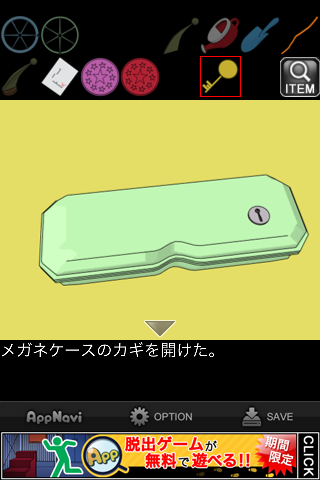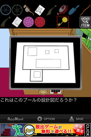 脱出ゲーム "水底の秘密" 無料 0 評価する 送信する 攻略その6 メガネケースを「黄色いカギ」で開ける。 「老眼鏡」を入手。 メガネケースの暗号を確認。数字をアルファベットにしたものの最初の2文字ずつを表しており、4桁の数字が分かる。 金庫の引き出しの一番下に入力。 中から「プールの設計図」を入手。 「アクリル板」を組み合わせると、地図が出来上がる。 ×印の地点、緑の扉へ。 左の小さな扉へ。 「老眼鏡」を調べる。 テンプルを「カギ」にする。 攻略その1 攻略その2 攻略その3 攻略その4 攻略その5 攻略その6 攻略その7