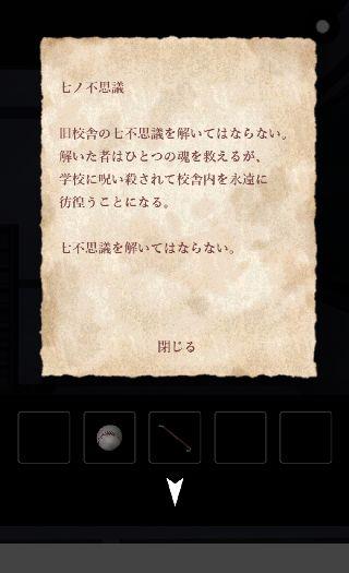 脱出ゲーム 学校の怪談 無料 4.2 評価する 送信する 攻略その5 1階に移動して、右奥へ。 突きあたりの扉から『メモ』を入手。 扉の上の『一球入魂』に「ボール」を使う。 「校舎のカギ」を入手して、扉の板を「バール」で外す。 扉に「校舎のカギ」を使って、脱出。 攻略その1 攻略その2 攻略その3 攻略その4 攻略その5