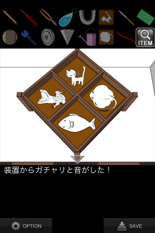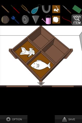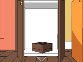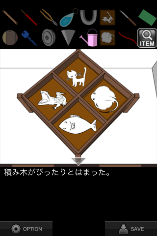 木箱に「猫の積み木」と「エイの積み木」をはめる。