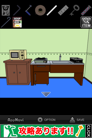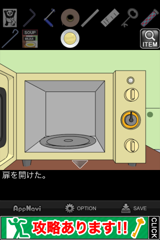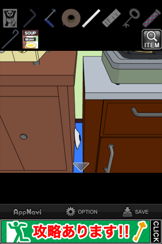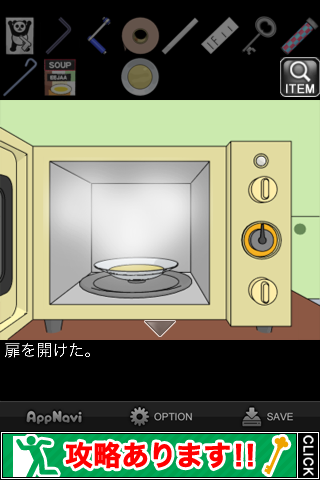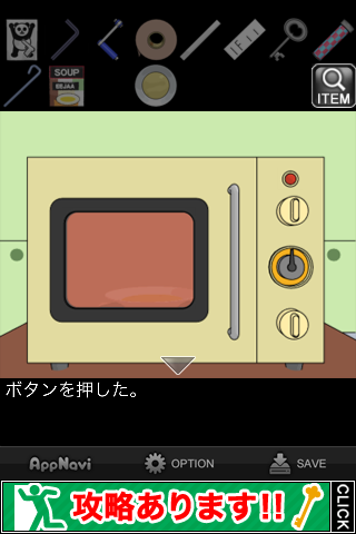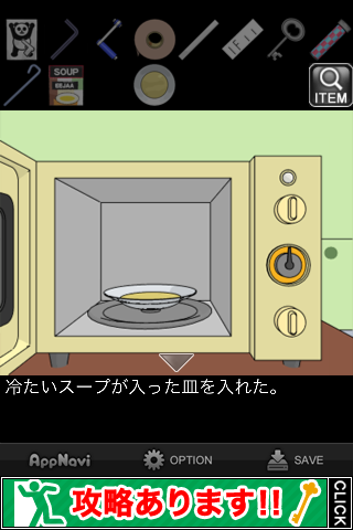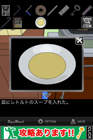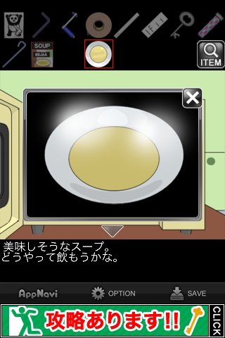 中から「スープ」を入手。所持品欄で調べて『どうやって飲もうかな』のメッセージを出す。