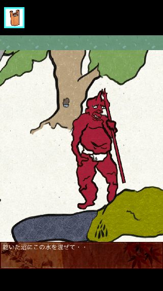 舌の乾いた泥に「水の入った桶」を使って、右にスクロールさせて井戸の前へ。