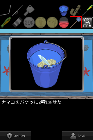 「バケツ」に海水を汲む。