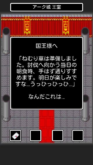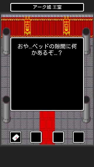 脱出ゲーム「勇者による魔王討伐を阻止せよ」 無料 0 評価する 送信する STAGE 9 アーク城 王室 2つのベッドの隙間を調べる。 「手紙」を入手して、次々と人物が現れてエンディングへ。 STAGE 1 城下町の宿屋(勇者の寝室) STAGE 2 城下町の宿屋(ロビー) STAGE 3 城下町の宿屋前 STAGE 4 秘密の地下通路 STAGE 5 王国の地下通路 STAGE 6 王国の地下通路 STAGE 7 アーク城 地下へつづく隠し部屋 STAGE 8 アーク城 隠し部屋連絡通路 STAGE 9 アーク城 王室