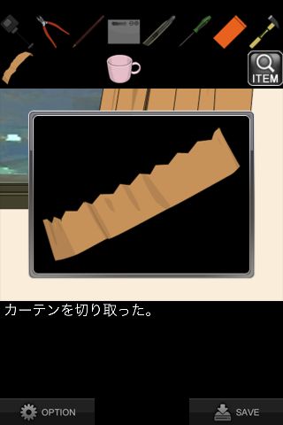 カーテンの前に移動して、「カッター」を使って「カーテン」を入手。